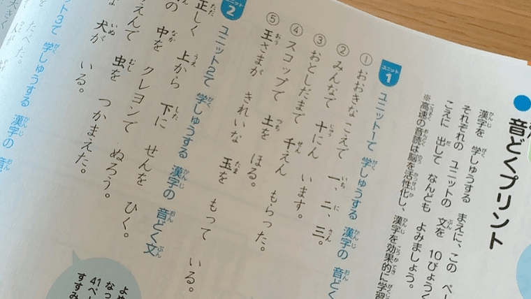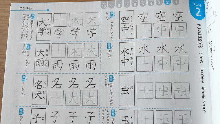 わが家では1回の音読で3〜4ユニット(半ページ分)を読み、全ての音読がすんなり読めるようになってから漢字練習ページに進みました。